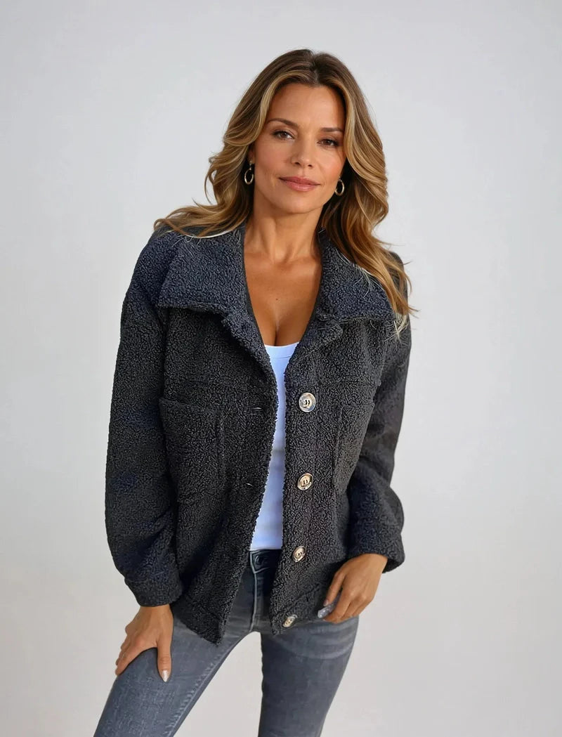 Add warmth and style to your autumn wardrobe with the Mila - Elegant autumn coat in soft powder pink sherpa! Carefully crafted from soft, textured sherpa fabric, this coat in a delicate powder pink is perfect for layering and easily complements your casual outings. Enjoy absolute comfort and a chic look throughout the season.